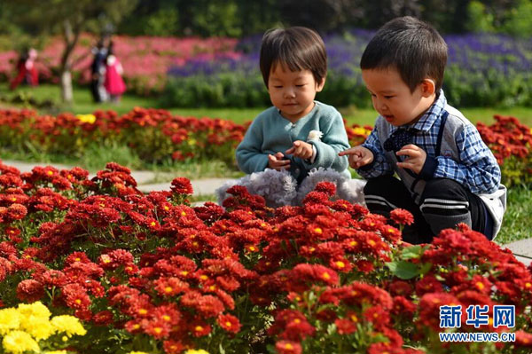 Two children look at red and yellow chrysanthemums at a park in Changchun, capital city of Jilin province, on Oct 2. [Photo by Zhang Nan/Xinhua] |