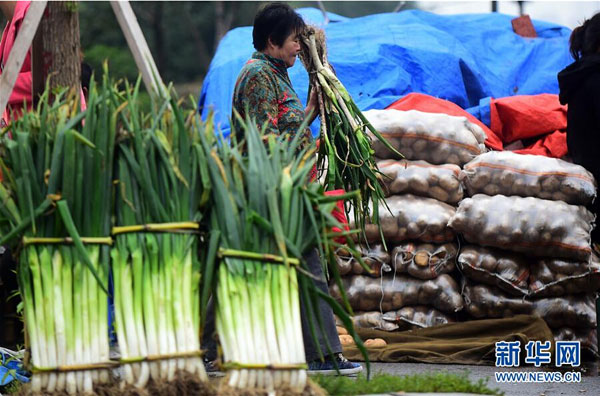 A woman carries a bunch of spring onions at the Minfeng agricultural products market in Changchun on Oct 3. As the temperature begins to quickly drop in Northeast China, people begin to store fresh vegetables such as carrots, potatoes, Chinese cabbages, and spring onions for use during the winter. [Photo by Lin Hong/Xinhua] |