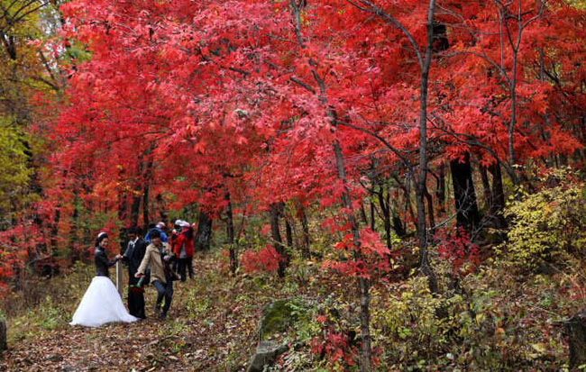 A couple prepares to shoot their pre-wedding photos against the background of red maple leaves. Lafashan Mountain National Forest Park in Northeast China's Jilin province is famous for its red maple in fall, and attracted many tourists on the first day of China's National Day holiday. [Photo provided to ejilin.gov.cn] |