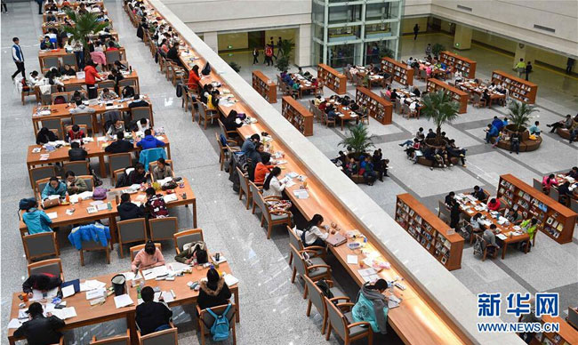 Some students decided to skip the relaxation portion of the holiday and used the time to study at the Jilin provincial library in Changchun on Oct 5 during the week-long holiday. [Photo by Xu Chang/Xinhua] |