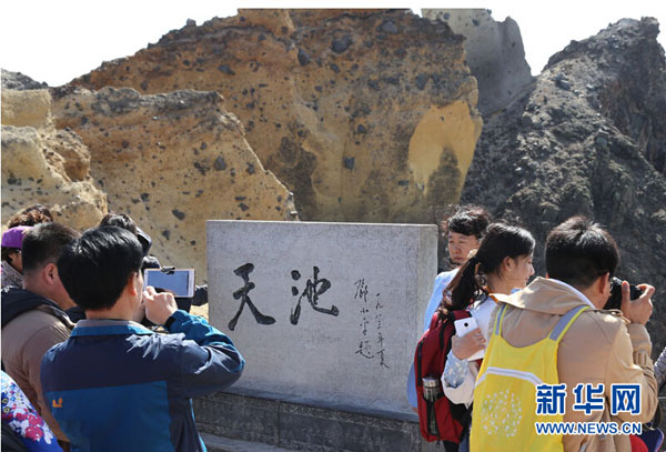 Tourists pose for photos at Tianchi Lake on Changbai Mountain in the Yanbian Korean autonomous prefecture, Northeast China's Jilin province, just before the National Day holiday. Altogether, 144,000 tourists made trips to the scenic spot during the holiday, up 20 percent from the previous year. On Oct 4, Changbai Mountain scenic spot saw 37,000 travelers, setting a new single day record. [Photo by Ren Junming/xinhuanet] |