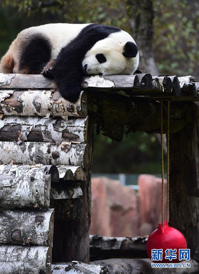 Meng Meng, a giant panda, sleeps in the panda house at the Jilin Siberian Tiger Park in Changchun, capital of Northeast China's Jilin province, on Oct 4. Many people came to see Meng Meng and Jia Jia, two giant pandas, during the National Day holiday. The two pandas, from the Dujiangyan panda base in Sichuan province, are on a three-year loan as part of a research project about pandas raised at higher latitudes. [Photo by Lin Hong/Xinhua] |