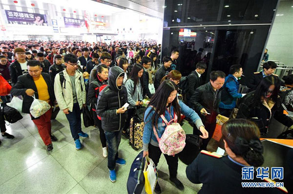 Changchun railway station sees a surge of travelers on Oct 7, the last day of the week-long holiday, as people return home. [Photo by Xu Chang/Xinhua] |